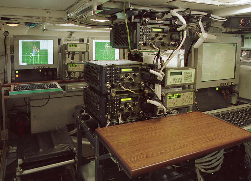 The communication is performed by UHF radios (TDMA and voice), an optional HF radio and wire means. Land navigation unit provides continously data about the current location and heading of the vehicle.